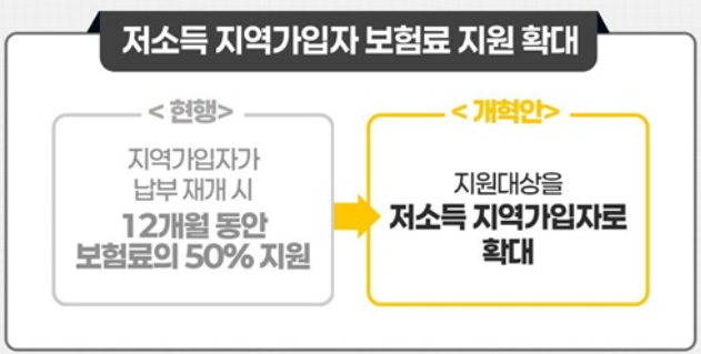보험료 인상에 대한 부담 완화를 위해, 저소득 지역가입자에게 최대 12개월간 보험료의 50%를 정부가 지원합니다.
