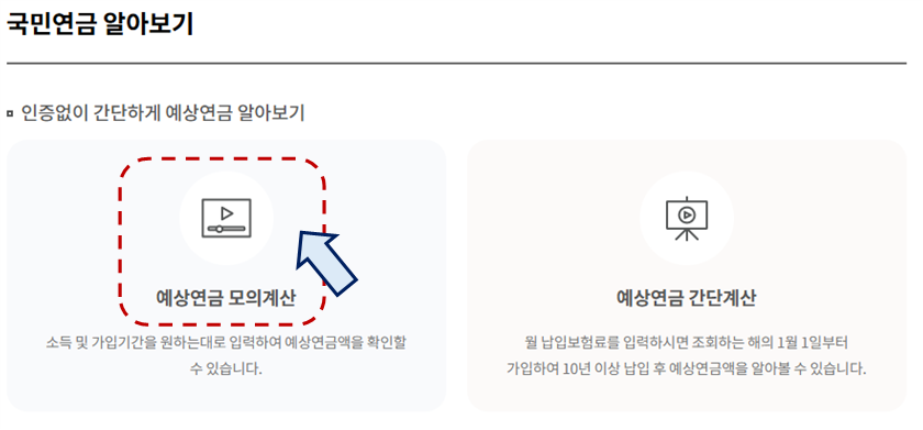 - [내 국민연금 알아보기 > 예상연금 모의계산] 클릭