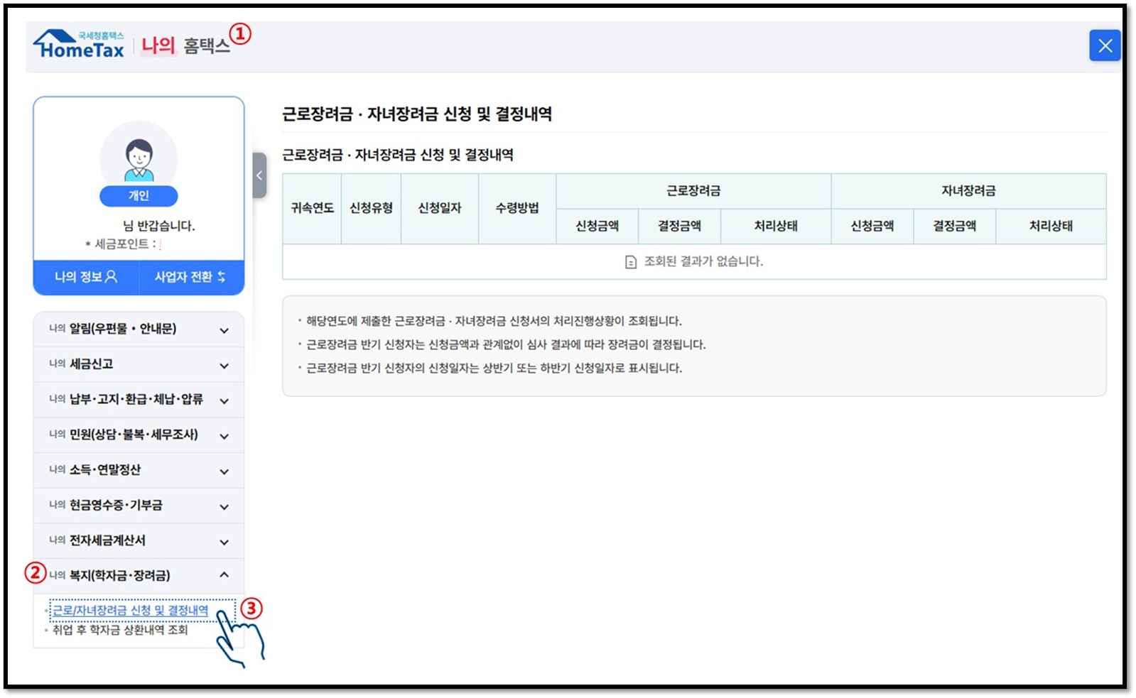 - [My홈택스] → [근로·자녀장려금,학자금상환] 선택 → ‘근로·자녀장려금 신청 및 결정내역’ 확인