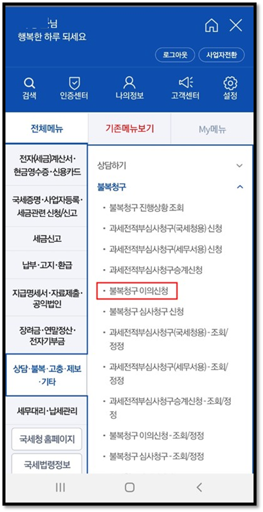 - 전체메뉴 : [상담·불복·고충·제보·기타] → [불복청구 이의신청] 메뉴 선택