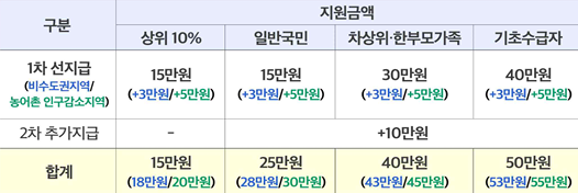 비수도권 주민은 3만 원, 농어촌 인구감소지역 주민은 5만 원이 추가됩니다. - 2차 지급은 9월 22일부터 진행되며, 소득 상위 10%를 제외한 국민 90%에게 10만 원이 추가로 지급됩니다.