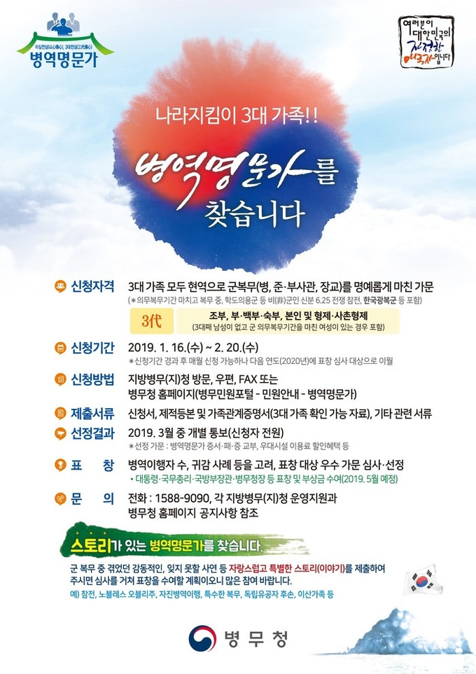• 선정 시 기념증서 및 병역명문가패 수여병무청 홈페이지 게재 등의 절차가 뒤따릅니다.