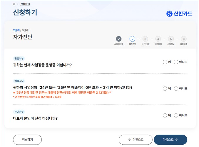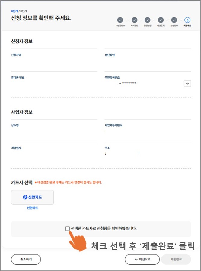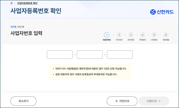 | 신청 절차 | 접속 → 신청하기 클릭 → 카드사 선택 → 사업자등록번호 확인 → 본인인증 → 개인 및 사업자 정보 입력 → 최종 확인 및 제출 |