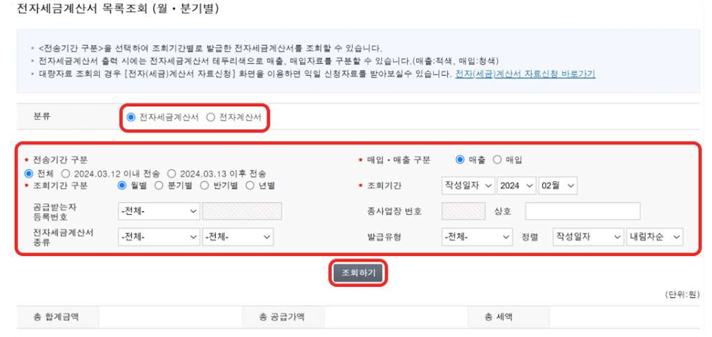 → 전자(세금)계산서 조회 → 전자(세금)계산서 월/분기별 목록조회