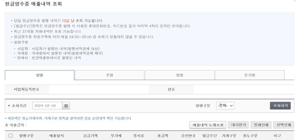 → 현금영수증 조회·발급수단 →가맹점→ 현금영수증 매출내역 조회