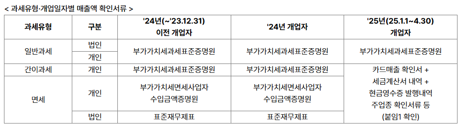 | 2023.12.31 이전 개업자 | 2024년 신고된 연 매출액 기준 | 단, 2024년 매출 없을 경우 2025년 상반기 신고 필요 |
