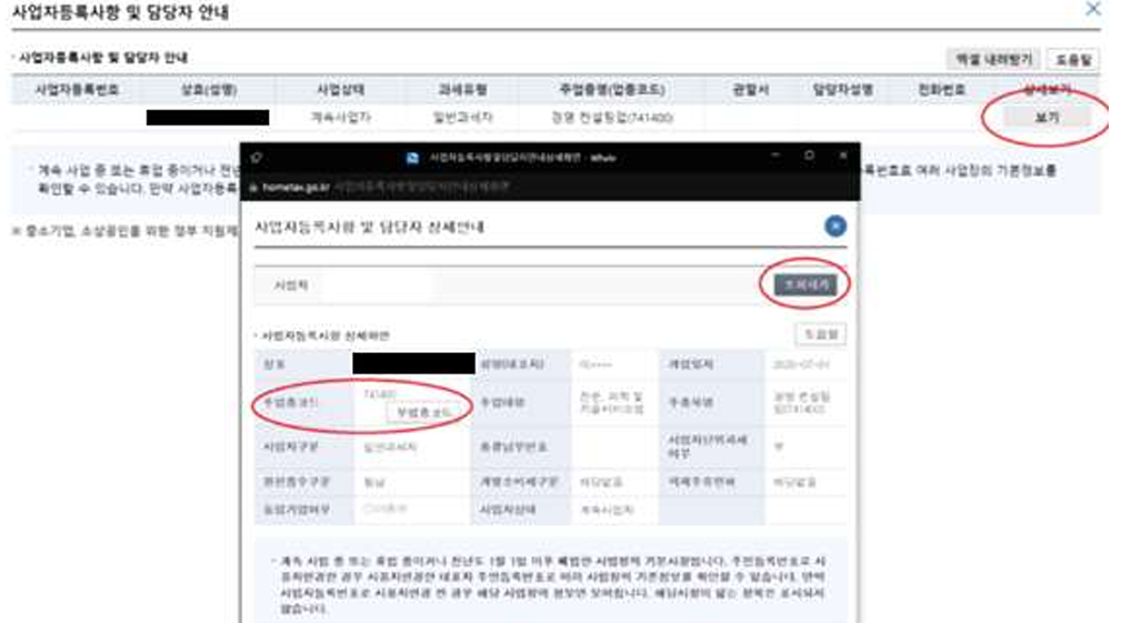 ④ 주업종코드 확인 홈택스 →기타 세무정보→ 사업자등록사항 및 담당자 안내