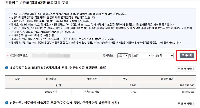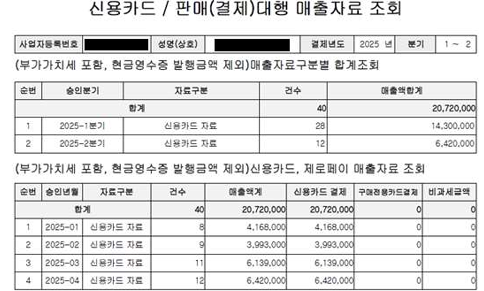 | ③ 카드 매출내역(분기별) | 홈택스 → 전자(세금)계산서·현금영수증·신용카드 →신용카드 매출→신용카드 판매(결제)대행 매출자료 조회 |