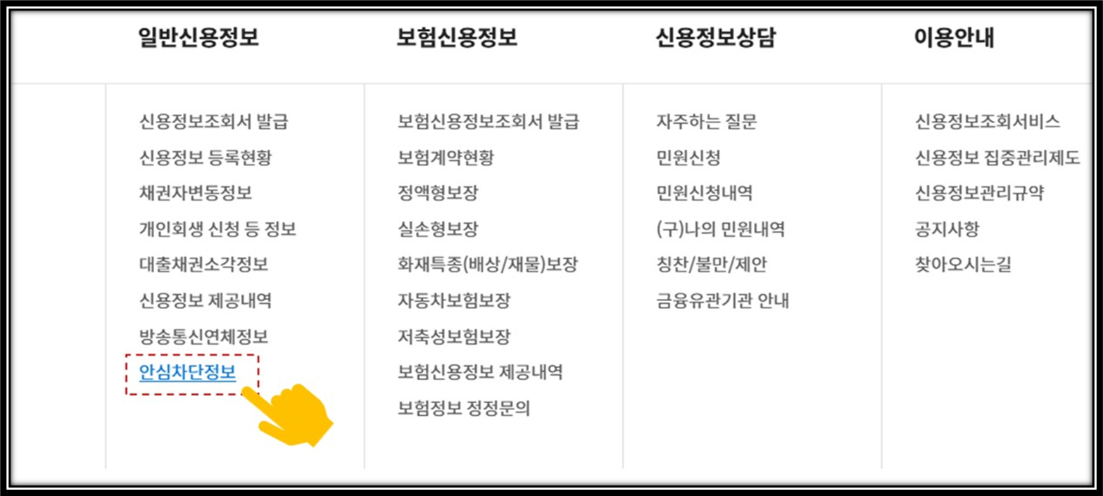 | 온라인 확인 | 한국신용정보원 누리집 → 로그인 → 여신거래 안심차단정보 메뉴 조회 |
