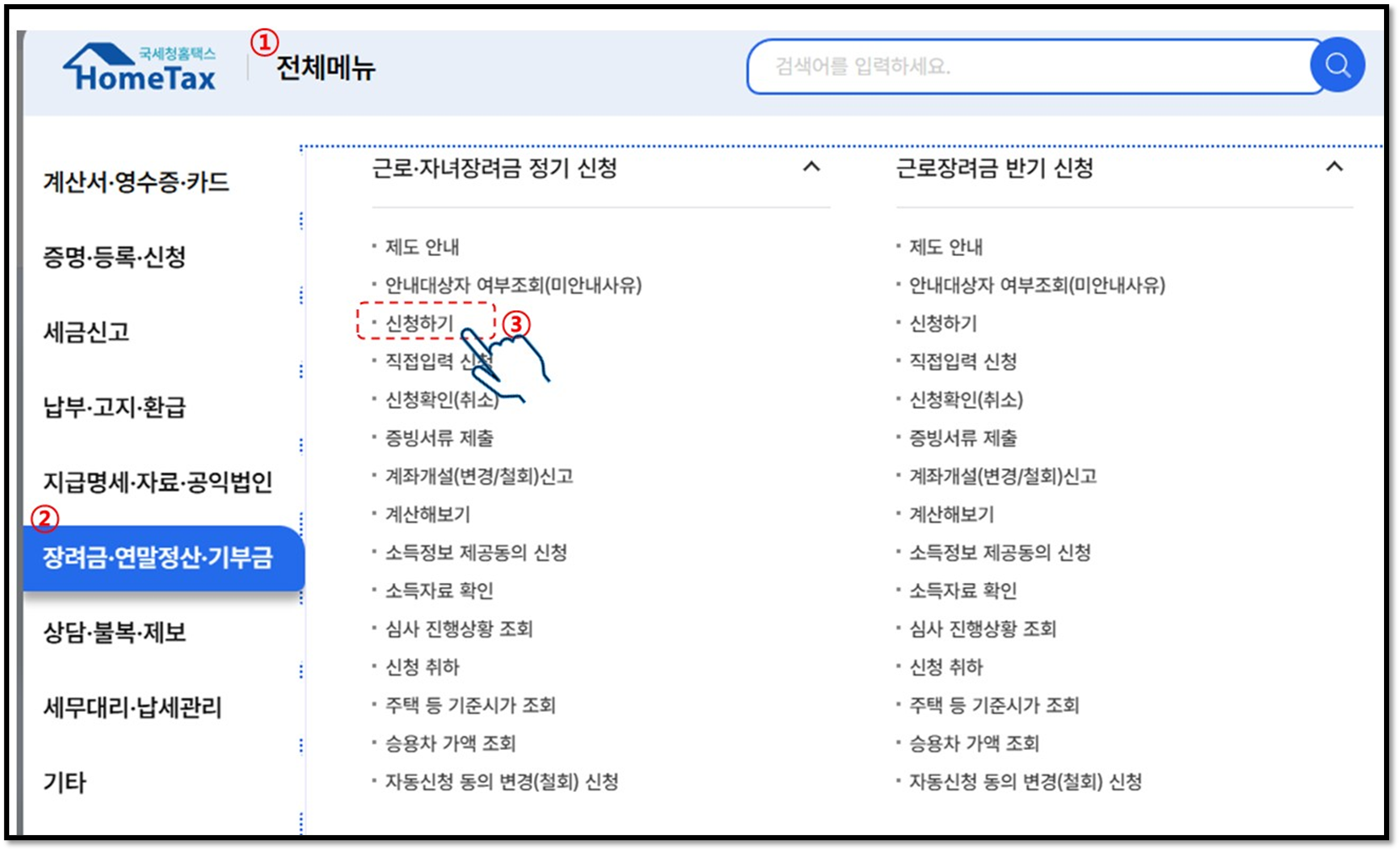 - 메뉴: 전체메뉴 > 장려금·연말정산·기부금 > 근로ㆍ자녀장려금 정기 신청 > 신청하기