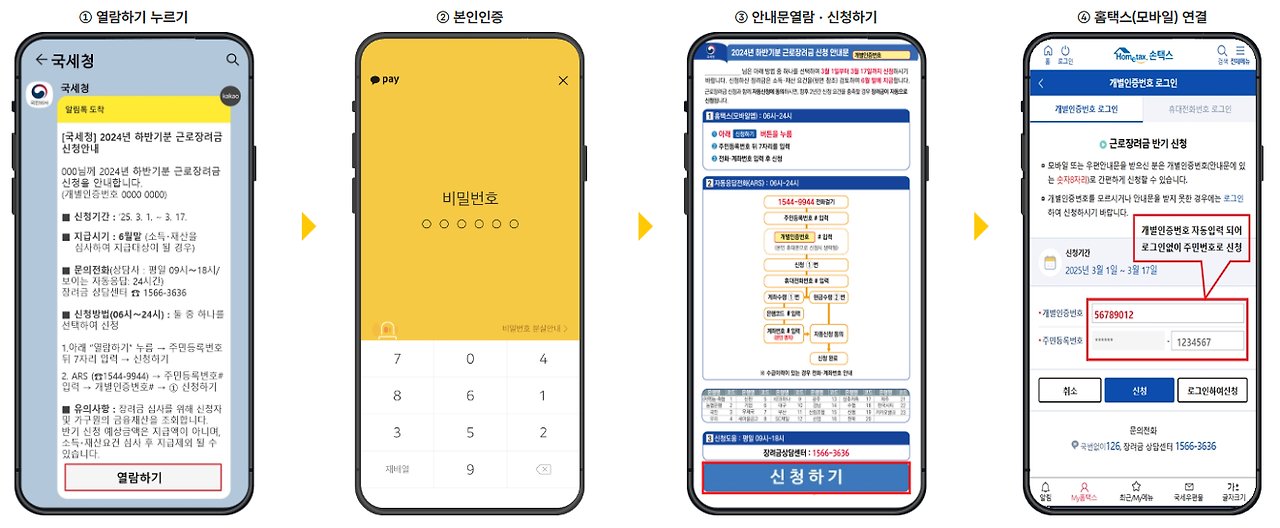 - 홈택스 모바일앱 실행 → 전체메뉴 → 장려금ㆍ연말정산ㆍ전자기부금 → 근로ㆍ자녀장려금 정기신청 → 신청하기 → '주민등록번호 7자리'와 '개별인증번호' 입력 → 신청하기