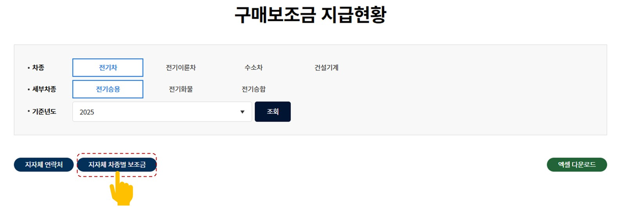 - [지자체 차종별 보조금] 클릭 → 원하는 지역의 [모델별 지방비 조회] 클릭 → 원하는 차종의 보조금 확인