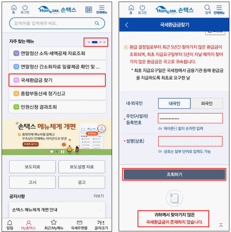 - [납부·고지·환급] → [국세환급] → [국세 환급금찾기] 클릭
