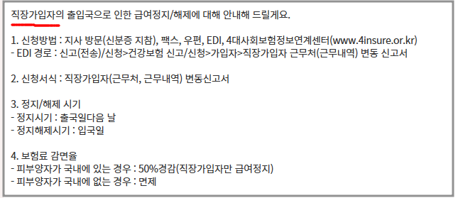 - 직장가입자의 경우 회사와의 고용관계가 유지되고 있다면 자격 정지 불가