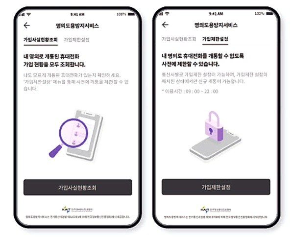 • 가입 제한 설정: 본인 명의로의 휴대폰 신규 개통, 번호 이동, 명의 변경 등을 사전에 차단할 수 있습니다.